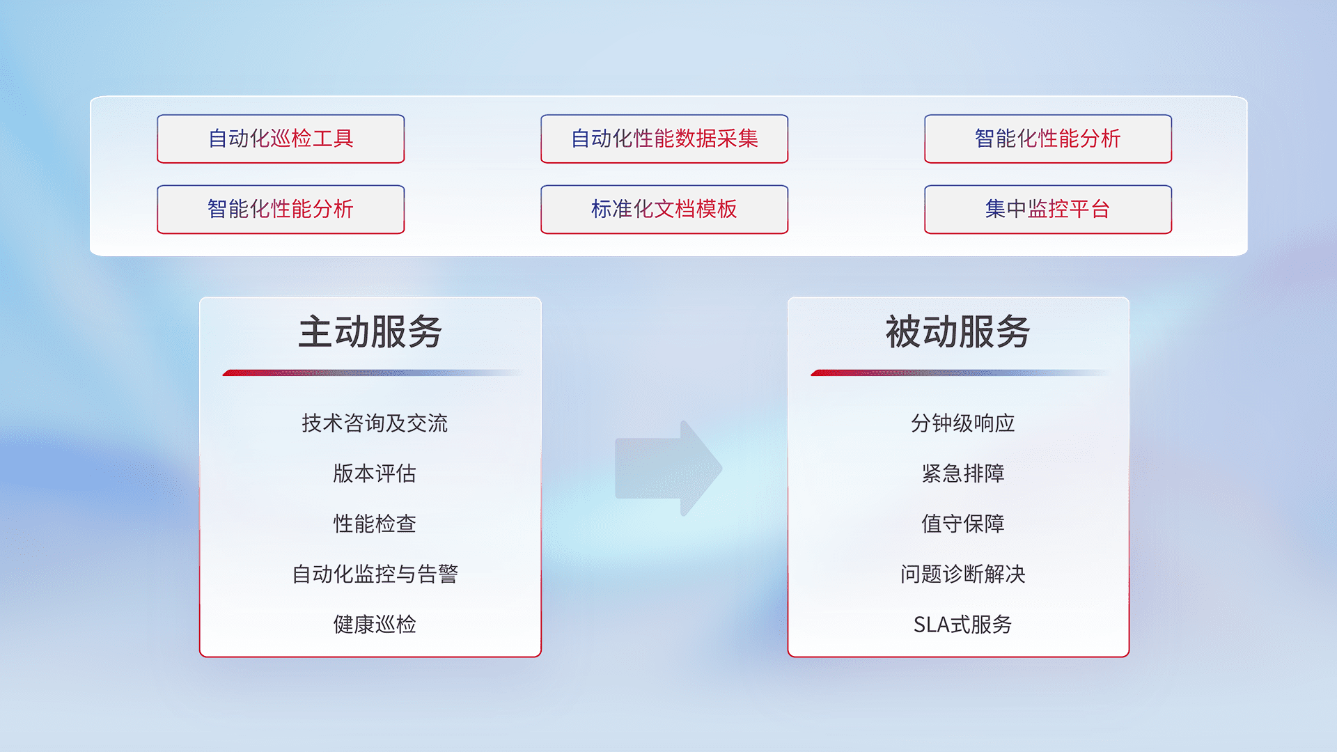 智能化工具和标准化文档,,,,保障服务质量,,,,提供主动服务(包含技术咨询、、、版本评估、、、性能检查、、自动化监控与告警、、、健康巡检)和被动服务包含(分钟级响应、、紧急排障、、值守保障、、、、问题诊断解决、、、、SLA服务)。。